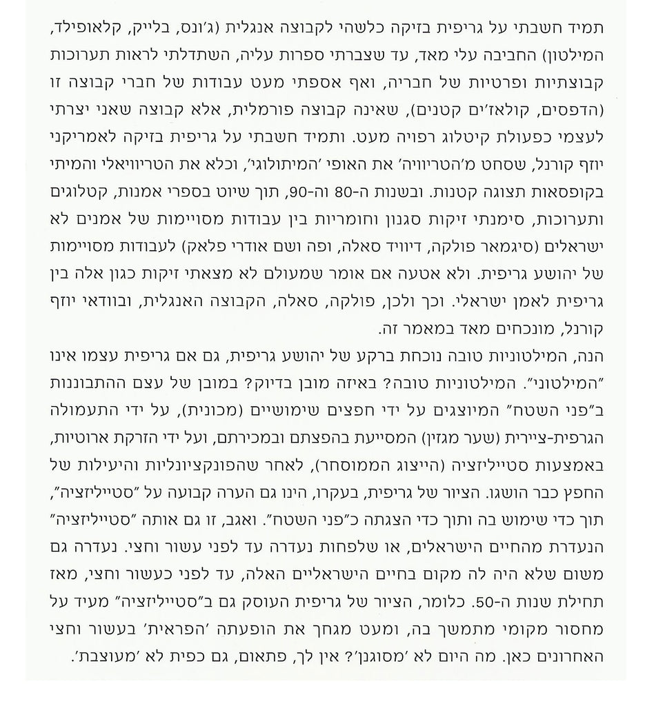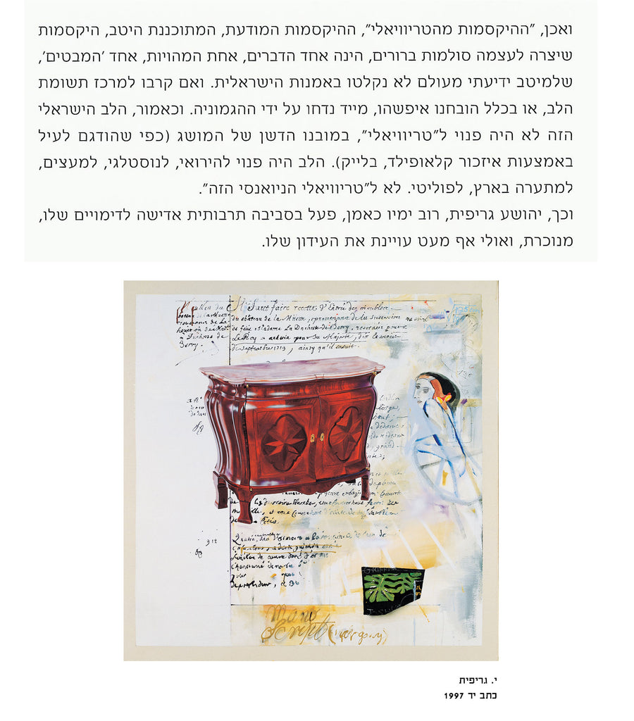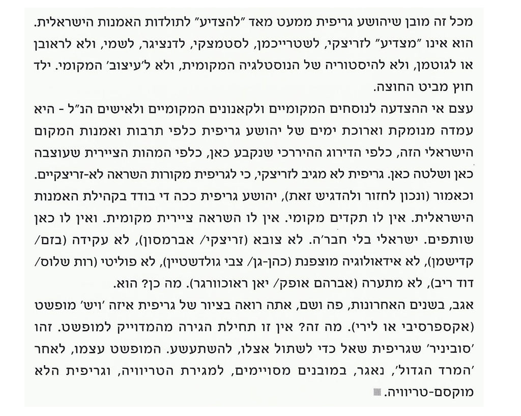 On Joshua Griffit’s attitude to “the surface”, on his fascination with the trivial, on his use of “ready-made painterly sentences” – and on his attitude to the misleading, the beautiful, the beautified, the artificial, stylization, mannerism, eclecticism, the model * On the unclosing distance between Griffit’s oeuvre and the central currents of contemporary Israeli art * Joshua Griffit: a majority of one in Israeli art.