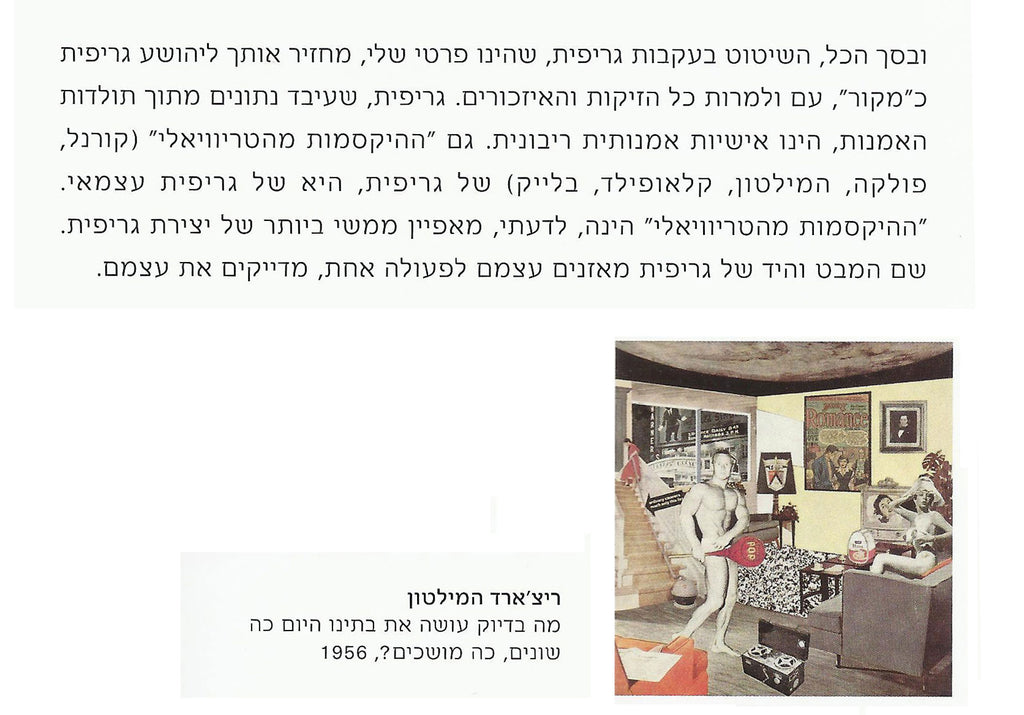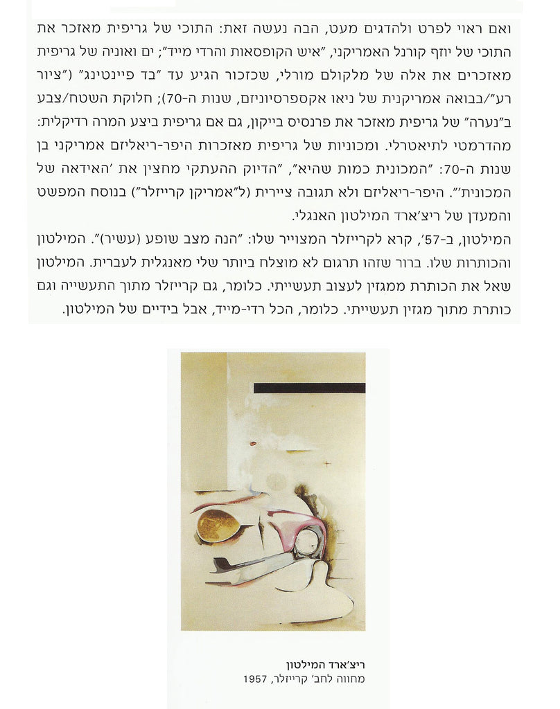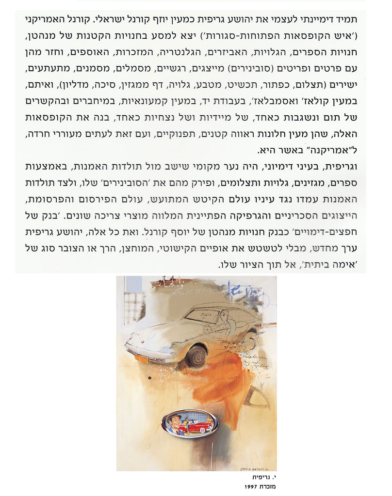 I have always thought of Griffit in some connection with an English group (Jones, Blake, Caulfield, Hamilton) that I like a lot, to the point that I have accumulated literature about it, have tried to see group and solo exhibitions by its members, and have even collected a few works by members of this group (prints, small collages), which is not formally a group, but rather a group which I created for myself as a somewhat loose act of cataloguing. And I’ve always thought of Griffit in connection with the American Joseph Cornell, who squeezed the “mythological” character out of “trivia” and imprisoned the trivial and the mythical in small display boxes. And in the ‘80s and the ‘90s, while cruising through are books, catalogues and exhibitions, I marked affinities of style and material between certain non-Israeli artists (Sigmar Polke, David Salle, and here and there Audrey Flack) and certain works by Joshua Griffit. And I will not be wrong if I say that I have never found such affinities between Griffit and any Israeli artist. Thus, and for this reason, Polke, Salle, the English group, and of course Joseph Cornell, are very much presenced in this essay. There is a goof Hamiltonianity present in the background of Joshua Griffit, even though Griffit himself is not “Hamiltonian”. A good hamiltonianity? In what sense precisely? In the sense of the very act of contemplating the “surface” that is represented by functional objects (a car), by the painterly-graphic propaganda (a magazine cover) which assists in their distribution and sale, by the injection of eroticism, by means of stylization (the commercialized representation), after the functionality and the efficiency of the object have already been achieved. Griffit’s painting, in its essence, is also a constant remark on “stylization”, while making use of it and while presenting it as the “surface”. By the way, this is also the same “stylization” which is absent from Israeli life, or at least was absent until a decade and a half ago. It was absent also because there was no room for it in this Israeli life, since the early ‘50s, until a decade and a half ago. I.e., Griffit's painting, Which also deals with “stylization”, attests to the prolonged local lack of it, And slightly ridicules its “wild” emergence here in the past decade and a half. What is not “stylized” today? You suddenly can’t find even a spoon that isn’t “designed”.