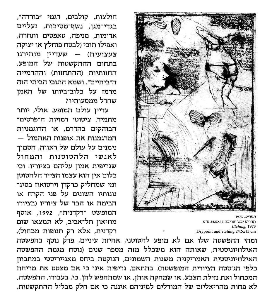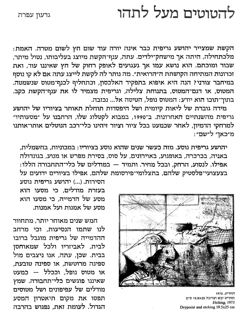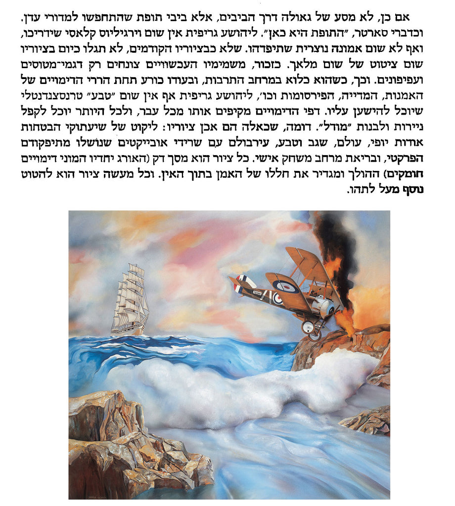 The bow that Joshua Griffit paints no longer shoots any arrow at any target. Actually, from the outset it was only a children's toy. Now, the bow-branch is displayed in its humiliation, stringless, broken, and stained. It carries with it only longings for a distant horizon of an arrow that is no more, and memories of the arched "heroic" stretching. What remains for the bow to represent now if not one more line in a formal composition? Here it is then, in the role of the diagonal, and as a substitute for the airplane-wing that has dropped off. The airplane, or the model airplane, is in a diving posture, and Griffit attaches the bow-branch to it as a crutch. Within himself he knows: the plane is falling, the flight to ... has failed.