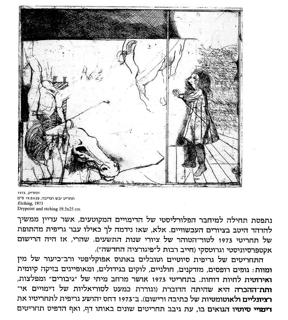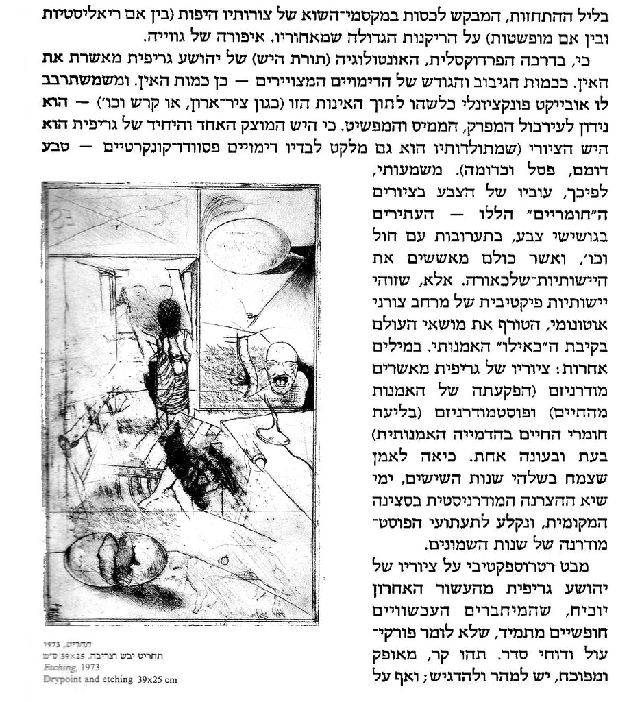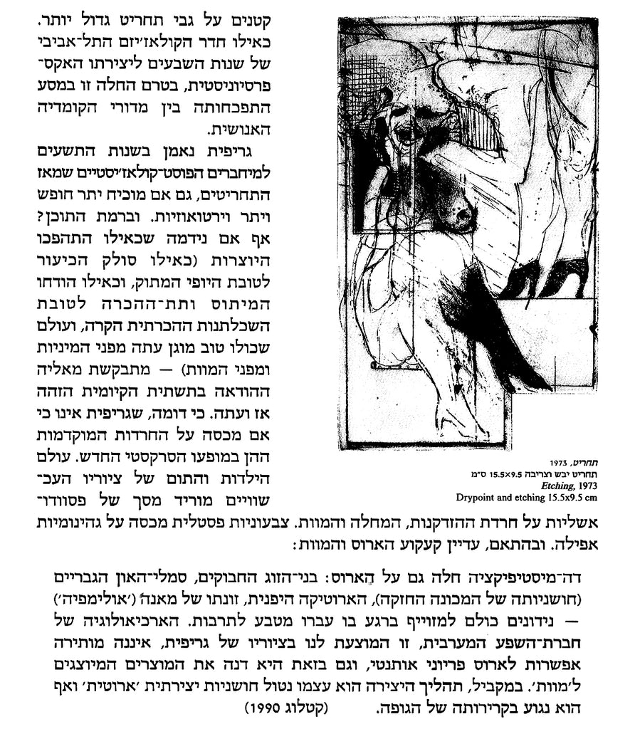 The retrospective view brings us back to 1973 and to Joshua Griffit's etchings. The eye is caught first of all by the pluralistic composition of the fragmented images, which still continues to resonate well in the recent paintings. Except that then it seems to you as if Griffit has passed from the inferno of the 1973 etchings to the age of purity of the paintings of the nineties. Because then the drawing was expressionistic and grotesque (owing much to "The New Figuration"). Griffit's etchings are nightmarish and are plunged in an apocalyptic and super-ugly ethos of sex and death: flabby, ageing, diseased bodies, suffering from tumors, and characterized by an existential and erotic affinity to repulsive animals. In the 1973 etchings, a mythical space of "heroes" and monsters was affirmed, and the subconscious was the speaker (which pulled to what was almost a surrealism of irrational images and an automatism of writing and drawing). In 1973 Joshua Griffit compressed the images of his burgeoning nightmares into his etchings, when he piled various etchings onto the same page, and also printed small etchings on top of a larger etching. It is as though the Tel-Aviv collagism of the seventies had penetrated into his expressionistic art even before the latter had begun its sobering journey among the spheres of the human comedy. In the nineties Griffit is faithful to the post-collagistic compositions that began with the etchings, even if he does evince more freedom and more virtuosity. And on the level of the content? Even if it seems as if the tables have been turned ( as if the ugliness has been banished in favor of the sweet beauty, and as if the myth and the sub-conscious have been deposed in fay or of the intellectualism and the death), there is no avoiding the admission of an identical infrastructure both then and now. For it seems that Griffit is only covering up those early anxieties with his new sarcastic show. The world of childhood and innocence in his present paintings brings down a screen of pseudo-illusions over the anxiety of ageing, disease and death.