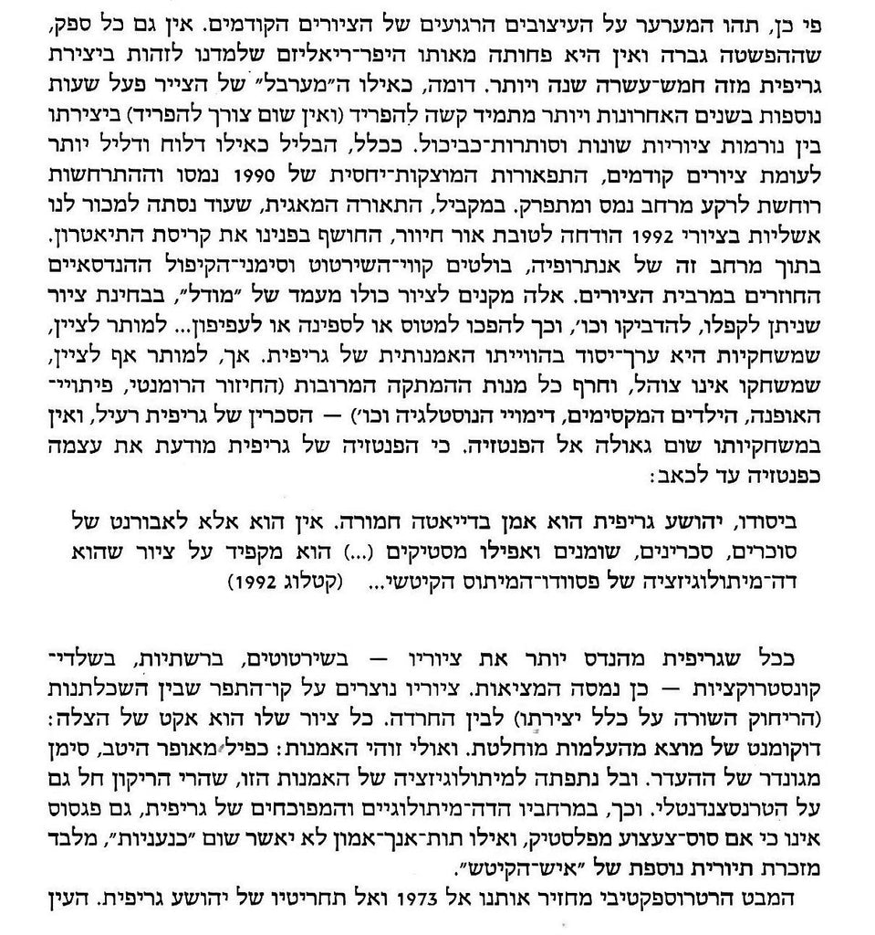 The more Griffit engineers his paintings - with geometrical drawings, with grids, with skeletons of constructions – the more the reality dissolves. His paintings are created upon the interface between intellectualism (the distantiation that suffuses the entire work) and anxiety. Each painting of his is an act of rescue: a document of emergence from absolute disappearance. And perhaps this is the art: a well made-up double, a dandified sign of absence. And let us not be tempted to mythologize this art, because the voiding also applies to the transcendental. And thus, in Griffit's sober and de-mythologized spaces, even Pegasus is only a toy horse made of lastic, while Tutankhamen will not approve any "Canaanism", apart from a tourist souvenir of "the Kitsch-man".