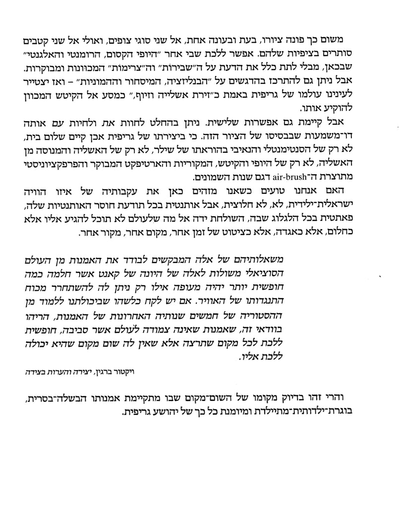 Griffit destroys, with his own hands, "the vehicle which is supposed to carry him to his dream destination," writes Ofrat in his sharp-witted introduction. Griffit deals with dreams — the erotic dream not excluded — or performs a demystification of these. In this view, he is "a dreamer who spoils dreams". As a result, his pictures simultaneously address two types of spectator, and possibly two contradictory poles in their expectations. One can be captivated by their "romantic and elegant magical beauty" without at all relating to their deliberate and controlled "ruptures" and discordance. But one can also concentrate on the emphases on "the banalization, the commercialization and the popularization", and then we can perceive Griffit's world as really "an arena of illusion and faking", as a journey into Kitsch in order to exorcize it.