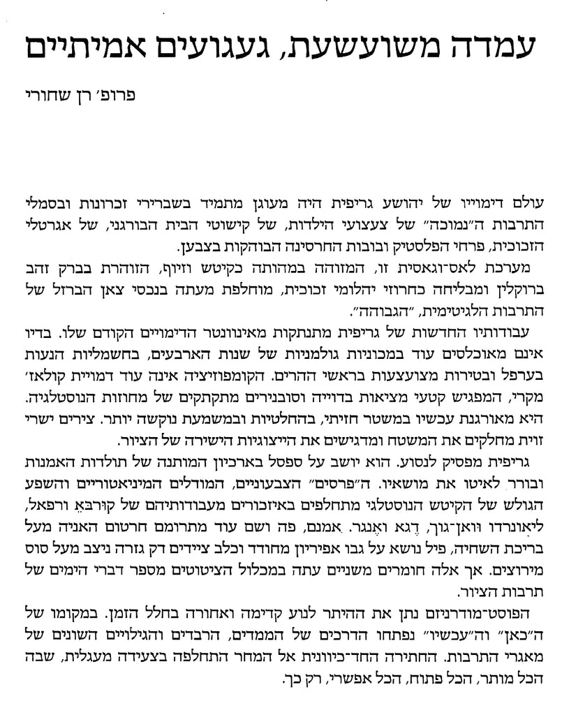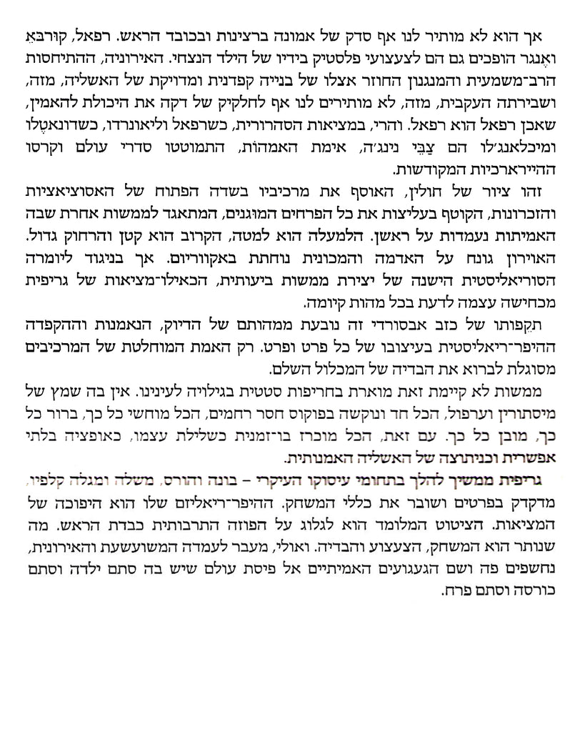 This is a secular painting, which gathers its components from the open field of associations and recollections, merrily picking all the protected flowers, rallying itself into a different actuality where truths are turned head over heels. Down is up, the near is small and the far is large. The airplane groans on the ground and the automobile lands in the aquarium. But in contrast to the old surrealistic pretension of creating an alarming actuality. Griffit's quasi-reality denies itself to knowledge with all the essence of its existence.